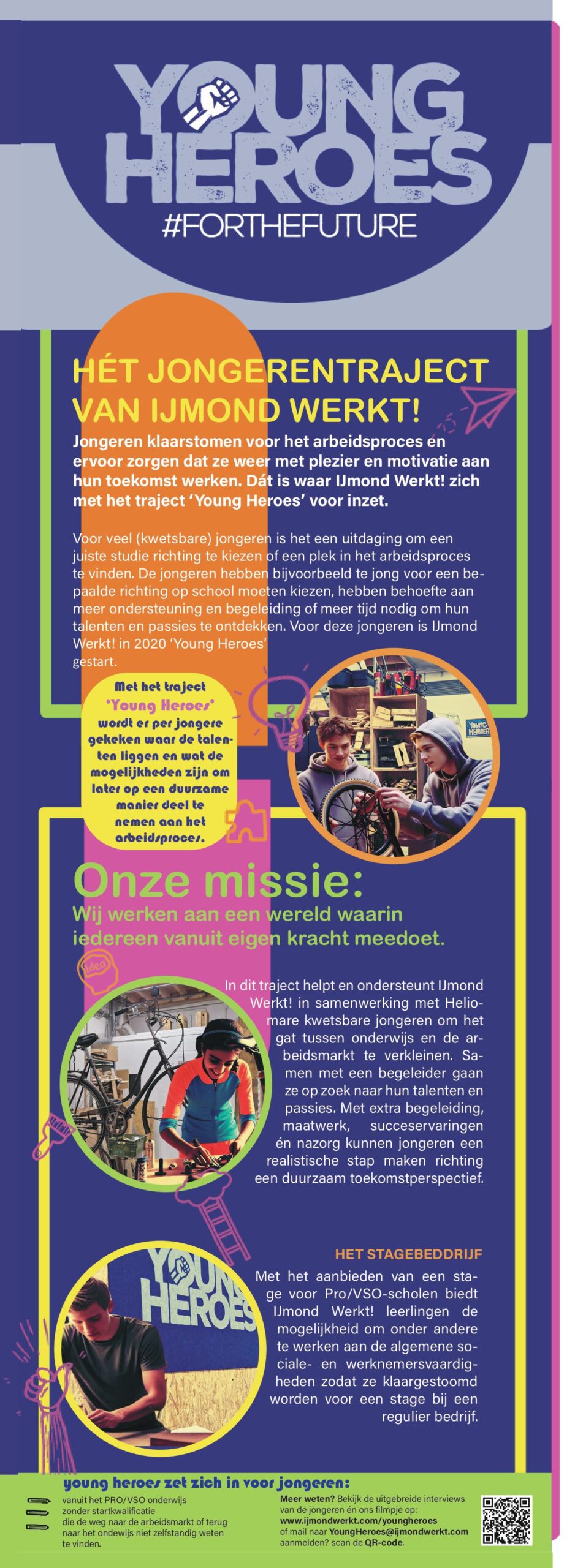 Voor veel (kwetsbare) jongeren is het een uitdaging om een juiste studierichting te kiezen of een plek in het arbeidsproces te vinden. De jongeren hebben bijvoorbeeld te jong voor een bepaalde richting op school moeten kiezen, hebben behoefte aan meer ondersteuning en meer tijd om hun talenten te ontdekken of hebben extra begeleiding nodig. Voor deze jongeren is IJmond Werkt! in 2020 ‘Young Heroes’ gestart. Een traject om jongeren tot en met 27 jaar klaar te stomen voor het arbeidsproces of richting onderwijs en ervoor te zorgen dat ze weer met plezier en motivatie aan hun toekomst werken.
